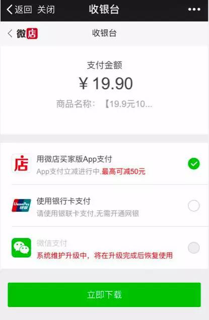 易亚电商尝试在微店下单,只能选择使用银行卡支付或者去微店APP支付,而微信支付已是灰色选项,提示“系统升级维护中,将在升级完成后恢复使用”。